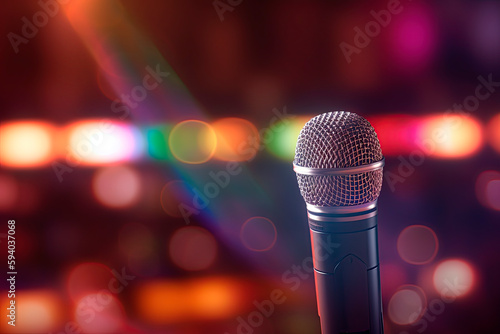 icrophone on stage. Close up of microphone setting on stand with colorful light bokeh background in conference hall
