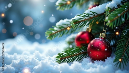 Icy winter scene with red gold ornaments on fir branches, ornaments, fir