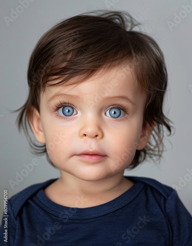 ID Photo for Passport : European baby boy with straight short black hair and blue eyes, without glasses and wearing a navy t-shirt