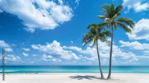 Idyllic tropical beach scene featuring two tall palm trees against a backdrop of clear blue sky and pristine ocean, evoking serenity and relaxation in nature.