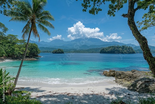 Idyllic tropical beach scene with white sand, turquoise water, palm trees, and mountains in the background.