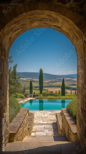 Idyllic Tuscan Villa: Poolside Serenity with Rolling Hills and Cypress Trees Under a Clear Blue Sky