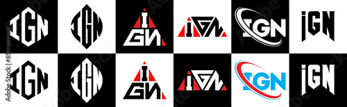 IGN letter logo design in six style. IGN polygon, circle, triangle, hexagon, flat and simple style with black and white color variation letter logo set in one artboard. IGN minimalist and classic logo