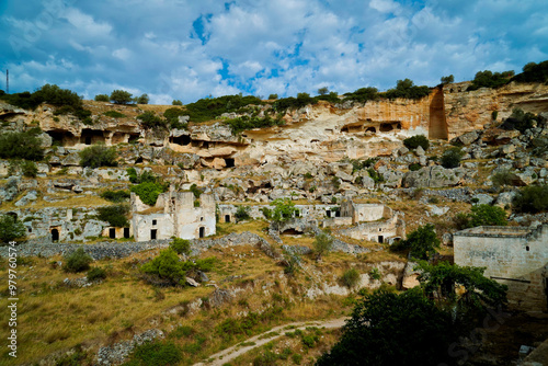 Il nucleo antico di Ginosa caratterizzato dalla gravina con antiche case e chiese rupestri, Taranto, Puglia, Italia