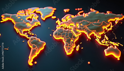 Illuminated 3D World Map with Orange Neon Glow Highlighting Global Borders