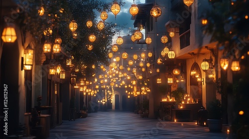 Illuminated alleyway at dusk, featuring hanging lanterns and warm lighting, creating a magical atmosphere.