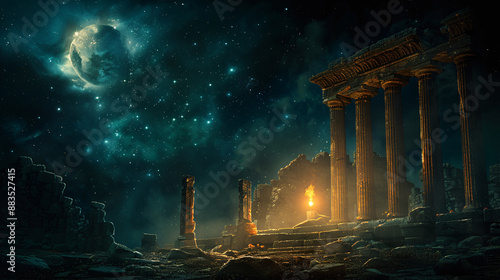 Illuminated Ancient Structure with Solitary Flame and Copy Space