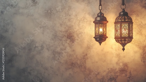 Illuminated Arabian Lanterns Hanging Against Textured Wall