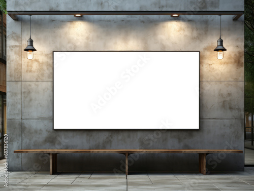 Illuminated blank billboard on a rustic wall at dusk. Urban advertising and design concept. Generative AI