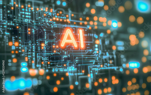 Illuminated circuit board showcasing artificial intelligence technology with vibrant lights and intricate design elements in a digital landscape
