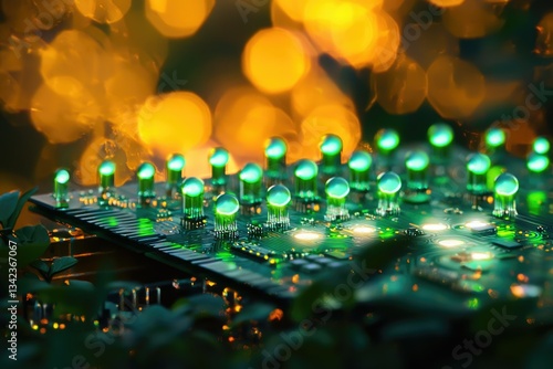Illuminated circuit board with green LEDs, bokeh background, technological advancement.