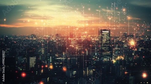 Illuminated cityscape overlaid with digital connections, showcasing the global market for electronics and IT.