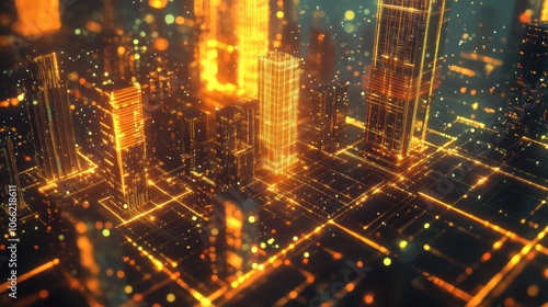 Illuminated Cityscape with Grid-like Streets and Buildings