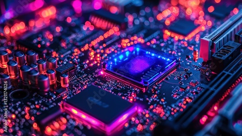 Illuminated Computer Motherboard with Chip and Electronic Components Close-up