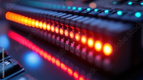 Illuminated control panel with colorful LED lights reflecting on a surface.