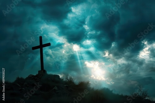 illuminated cross on hilltop silhouette against dramatic sky rays of light breaking through storm clouds symbolic representation of hope and faith powerful contrast between light and darkness