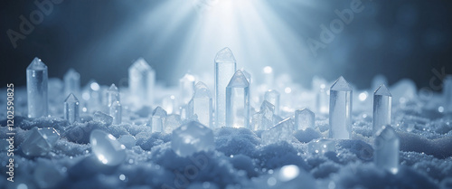 Illuminated Crystal Formations in Ethereal Setting Evoking Serenity and Collective Consciousness through Soft Lighting and Misty Background