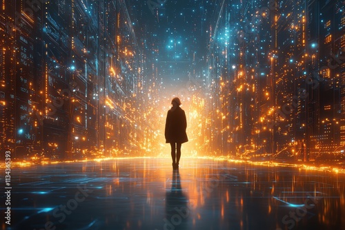 Illuminated data center corridor futuristic technology digital landscape high fidelity environment surreal viewpoint endless exploration