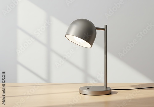 Illuminated Desk Lamp on Wooden Table with Shadow on White Wall