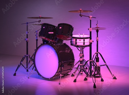 Illuminated Drum Set in a Studio Setting With Purple Ambient Lighting