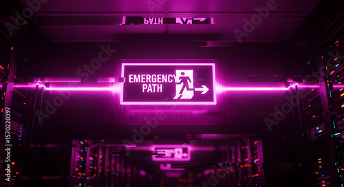 Illuminated Emergency Path Neon Sign Guides Through Digital Space