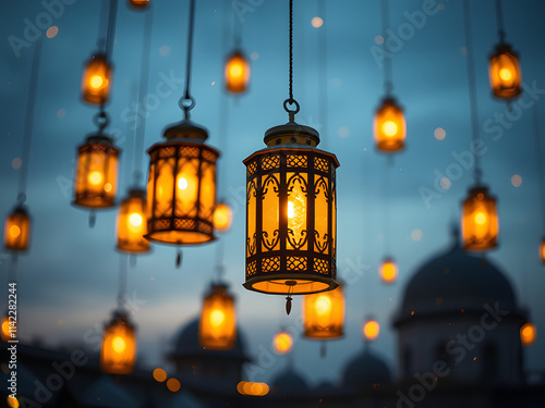 Illuminated Evening: A mesmerizing tapestry of warm, golden lanterns strung against a twilight sky, casting a soft glow on the cityscape.