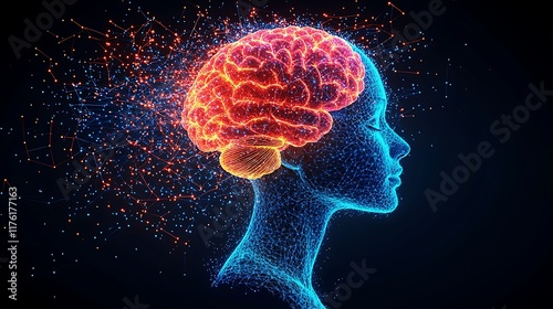 Illuminated female brain, neural network, dark background, medical concept, website design