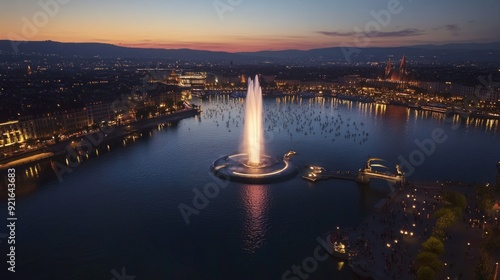 Illuminated Fountain and Cityscape at Twilight
