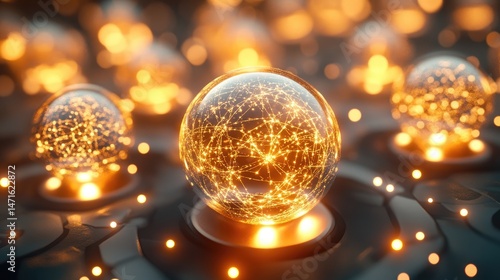 Illuminated glass spheres with internal glowing network, set on dark surface