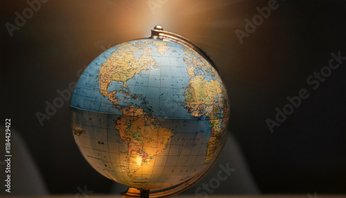 Illuminated globe showcasing continents and geographical features in a darkened setting
