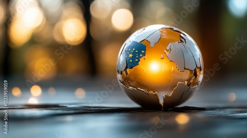 Illuminated globe with Europe map and European Union flag against a blurred background of warm autumn bokeh lights at sunset