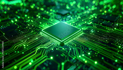 Illuminated Green Circuit Board: Futuristic Technology and Digital Processing Concept