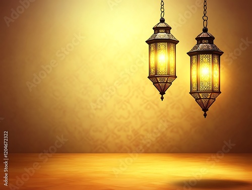 Illuminated Hanging Lanterns Against Golden Background
