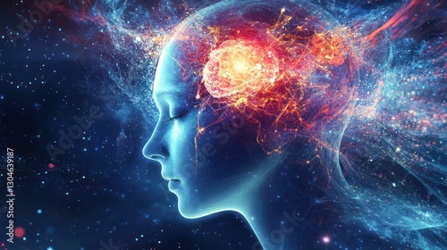 illuminated intelligence portraying human consciousness with glowing neural pathways and cerebral activity against a cosmic backdrop concept