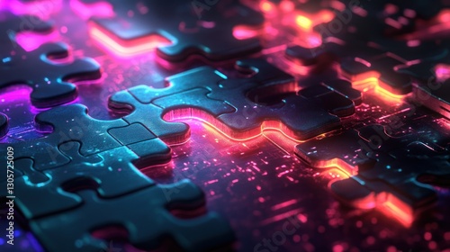 Illuminated jigsaw puzzle pieces creating a network with glowing edges