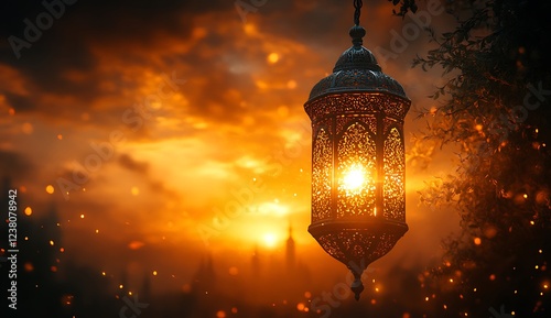 Illuminated lantern against a sunset with floating particles and silhouetted trees in the background