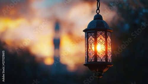 Illuminated Lantern at Sunset, Mosque Background