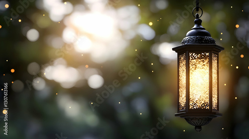Illuminated lantern hanging outdoors at sunset, bokeh background. Ideal for Ramadan, Islamic celebrations, or peaceful atmosphere imagery