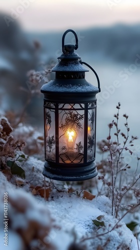 Illuminated lantern in snowy winter scene.