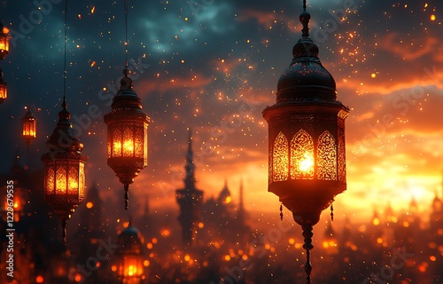 Illuminated Lanterns Against Sunset Sky with Mosque Silhouette