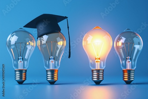 Illuminated light bulb among unlit ones with graduation cap on blue background symbolizing innovation, education, leadership, and business concept. Ai generative