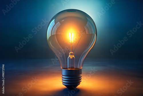 Illuminated light bulb glowing with warm light on dark blue background