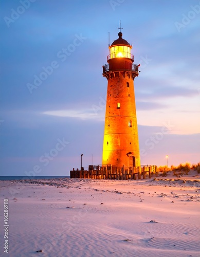 Illuminated Lighthouse on Sandy Beach at Dusk
