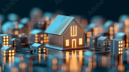 Illuminated Miniature House Model on Circuit Board Surrounded by Digital Cityscape at Night