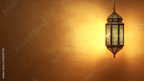 Illuminated Moroccan Lantern Hanging Against Warm Background
