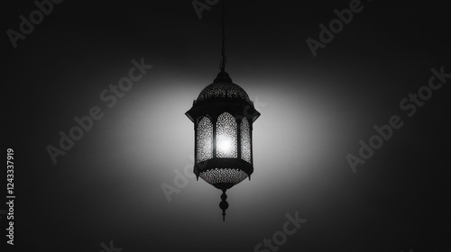Illuminated Moroccan lantern hanging, dark room, glowing light, Ramadan