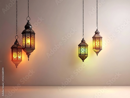 Illuminated Moroccan Lanterns Hanging Against Neutral Wall