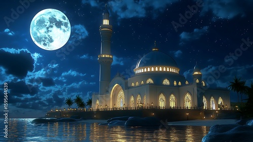 Illuminated mosque by the sea under a full moon.