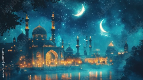 Illuminated Mosque Cityscape Under Twin Crescents