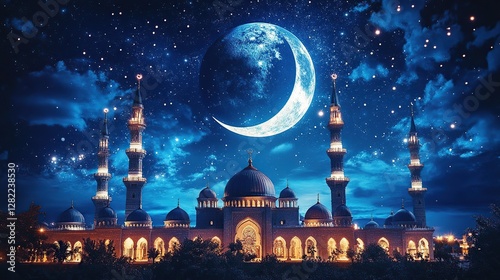 Illuminated mosque under crescent moon and starry night sky